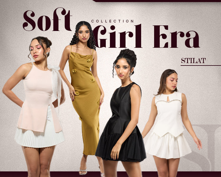 A curated collection of four exquisite outfits that understate glamour and delicate sophistication. Soft Girl Era collection features a harmonious blend of palette choice, with outfits in soft, muted tones and rich, dark hues.